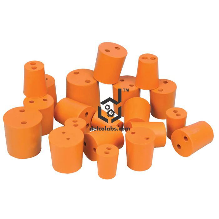 Pack of 50 assorted orange rubber stoppers each with 2x4mm diameter holes. Made of superior quality, long lasting rubber that is resistant to acids, alkali and ammonia. Contains the following quantities and sizes (bottom diameters): 10 pieces each of size 13, 15, 17, 18mm bottom dia., 3 pcs. each of 21, 23mm bottom dia. and 2 pcs. each of 25, 29mm bottom dia.