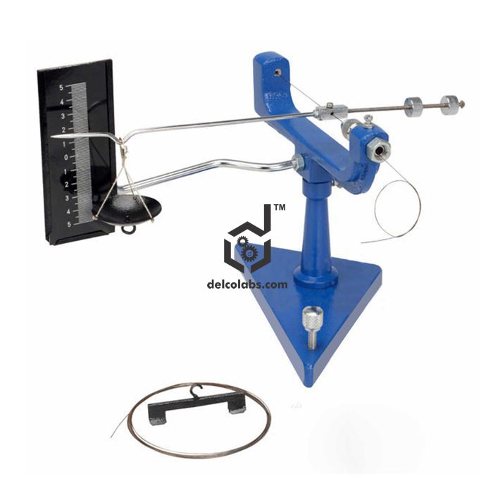 For determination of surface tension of liquids. Comprises a metal bridge attached to a vertical rod, which in turn is mounted on pillar of a heavy cast metal stand adjustable for height and has levelling screws. Across the two arms of U shaped bridge, a steel torsion wire is fixed with provision for adjusting its torsion. A pan is hung from a notch in the pointer and has a hook at its underside from which can be suspended a light weight rectangular frame or a metal clip to hold a micro slide edge. The tip of the pointer moves over a graduated scale mounted vertically on the end of arm fitted to the bridge. With rectangular wire frame, slide clip, six micro slides and spare length of torsion wire. The sensitivity of the balance depends on the modulus of elasticity of the torsion wire. Wire of different diameter will provide different sensitivities.