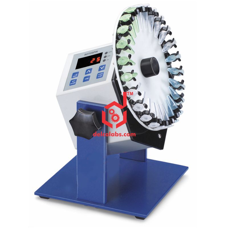 Ideal for mixing for diffusion, dialyzing, extraction etc. Comprises a sturdy circular disc with flexible, plastic coated spring clips for holding test tubes of diameters 10-30mm and is mounted on the rotor assembly. The rotor assembly has variable speed motor with provision for adjusting rotational speed from 5 to 50 RPM. Also incorporates a user settable timer from 0-99 hours / 1-59 minutes. The complete rotor assembly is supported on two parallel vertical pillars by thumb screws providing secured clamping and allows for adjustment of angle of rotation of the test-tubes disc anywhere between horizontal (for minimal mixing) to vertical (for full end over end mixing). The electronic touch-panel control allows for convenient operation, which is further substantiated by large sized digital LED display. Operates on 220V AC, 50Hz.