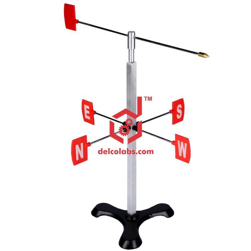 A simple device for determining the direction of flow of wind. Comprises a large arrow mounted on a metal rod with bearing and mounted on top of steel pivot that aligns itself along the wind. Complete assembly mounted on a metal pillar that carries four arms terminating in the compass cardinal point symbols marked NEWS.