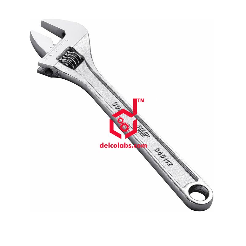 Drop forged nickel chrome molybdenum steel wrench with one jaw adjustable by means of a square cut screw. Overall length 150mm. Maximum jaw opening 20mm.