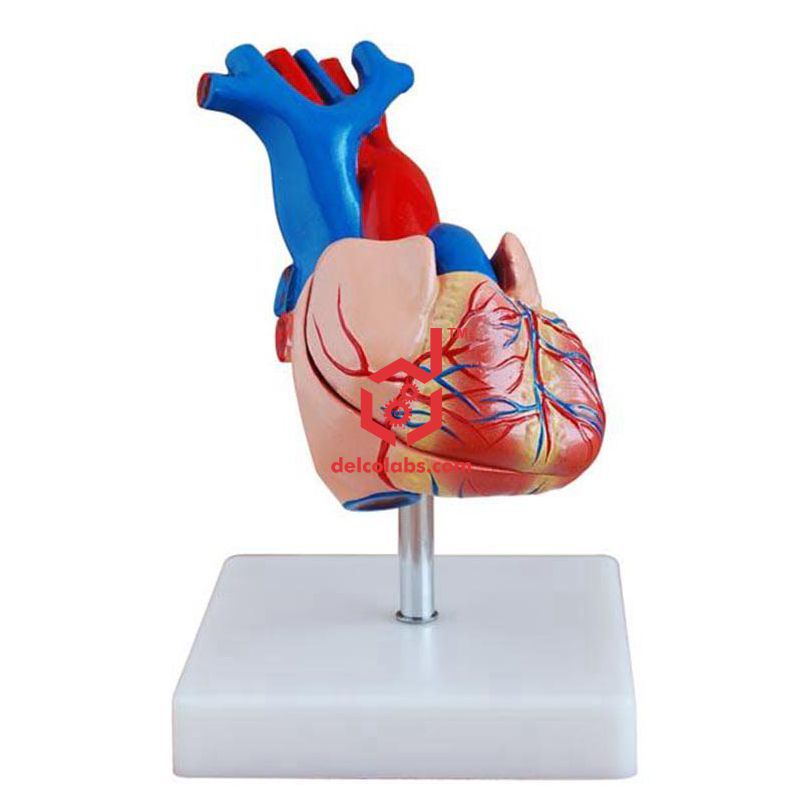 This model is three times life size and separates into four parts for detailed study. Sectioned so that both ventricles and atria open to expose the valves & large blood vessels near the heart and musculature of the heart are also shown, mounted on base with numbered Key Card.