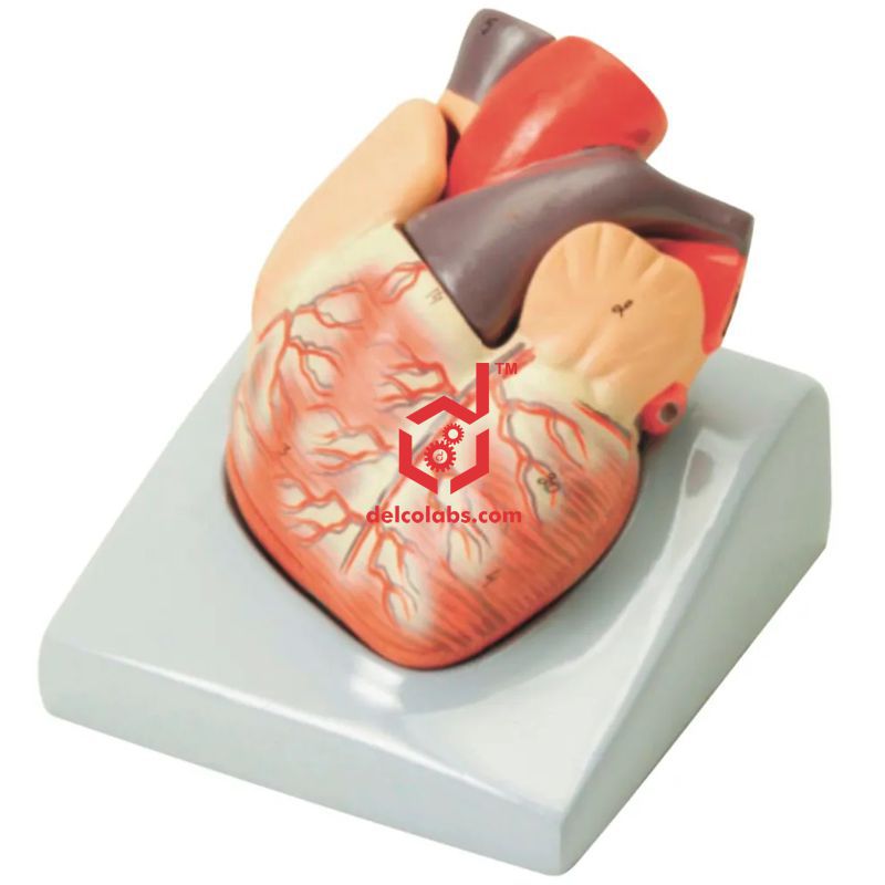 Dissectible into 4 parts on white base showing the outside of pericardium and diaphragm. The heart is cut by a vertical line towards the level of ventricular septum. The arc of aorta and superior vena cava can be removed, both auricles and ventricles with bicuspid and tricuspid semi lunar walls as well as the sigmoid valves can be easily seen. With numbered Key Card.
