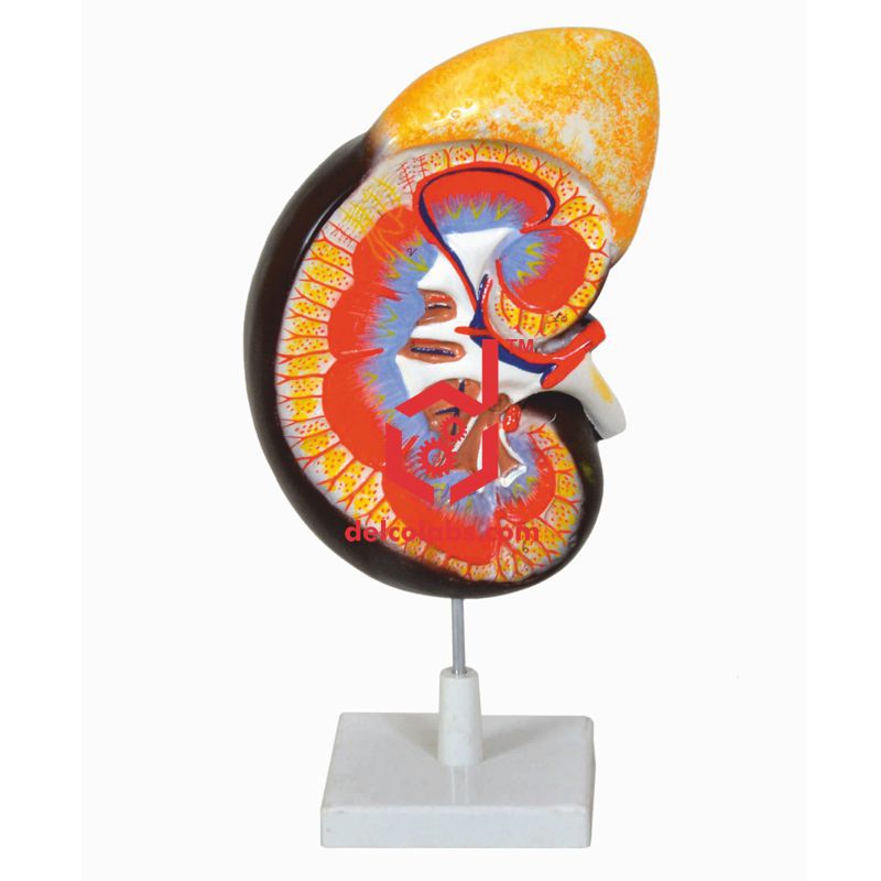 The intricately designed and highly detailed model is perfect for showing students the exterior and interior structures of a human kidney and adrenal gland, including the renal and adrenal vessels and the ureter. The model is mounted on a stand with numbered Key Card.