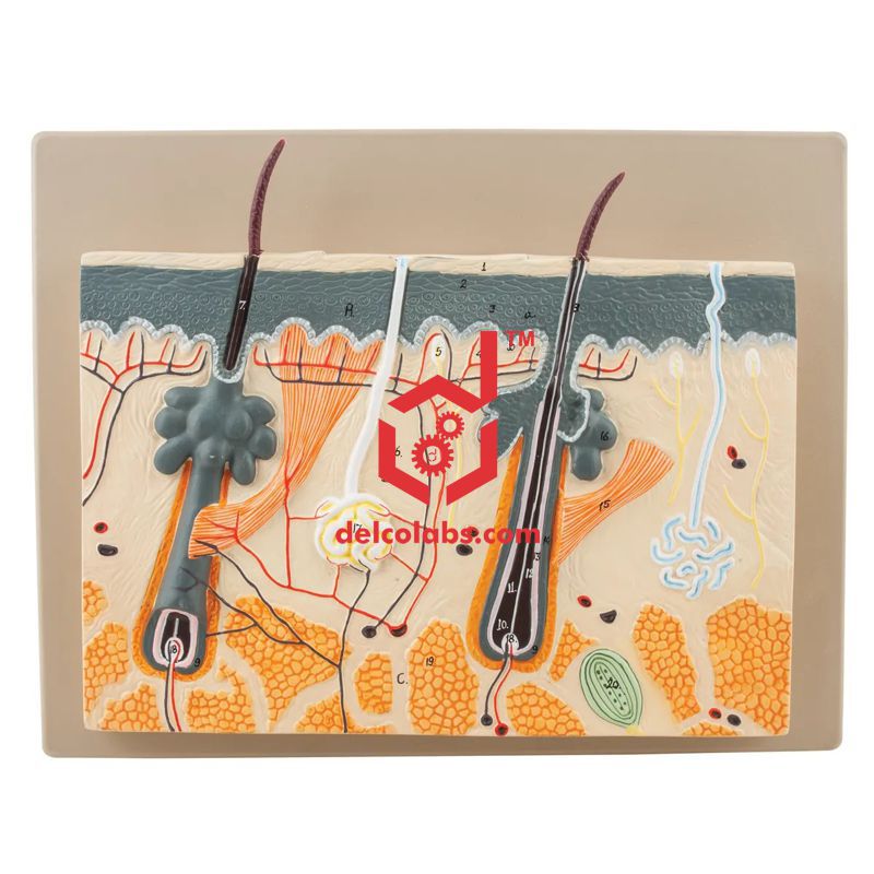 This relief model shows a section through the three layers of the haircovered skin of the head. Representation of hair follicles with sebaceous glands, sweat glands, receptors, nerves and vessels. Delivered on base with numbered Key Card.
