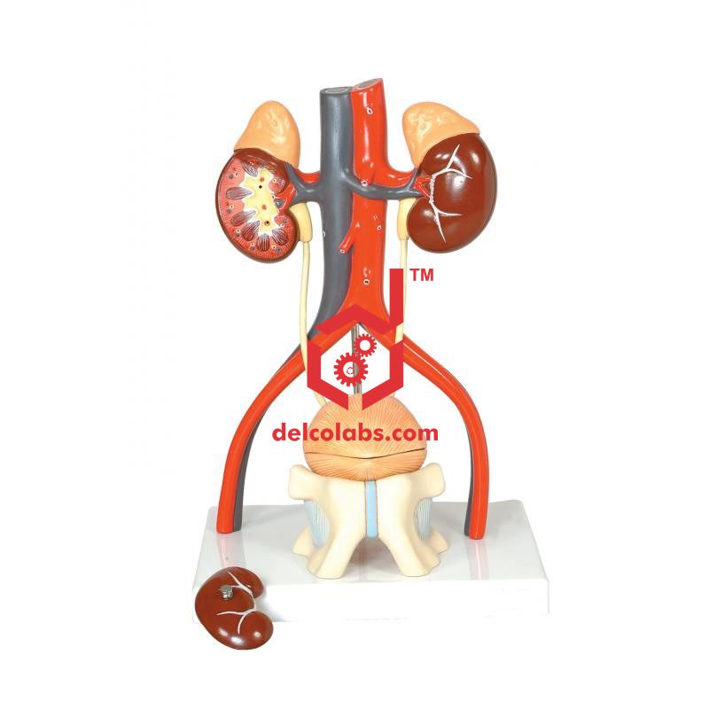 Three Dimensional Model can be seen from all angles. Slightly larger than life size and depicted in brilliant color, this model of the full urinary system can easily be seen by every student in the class. The vena cava and abdominal aorta are shown; the right kidney is partially dissected to show the cortex, medulla, pyramids, calyces, pelvis and origin of the renal artery and vein and tubing represents the ureter leading to the two - part bladder resting on the public symphysis. The bladder can be opened to reveal the mucosa, trigone, prostatic portion of the urethra, seminal vesicles, ejaculatory ducts, and vas deferens. The three-piece model is mounted on a base with numbered Key Card.