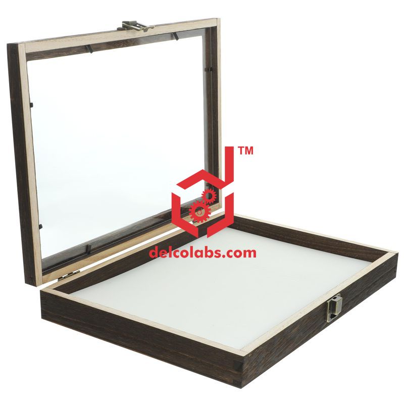 Seasoned wood frame with finger joints. Plywood bottom. Non-rattling glass in wooden frame top. Bottom has thick papered cork-sheet for pinning. Double walled to provide fumigation chambers perforated for pesticide provided and with two brass clips and index card frame. Moisture proof lacquer finish.