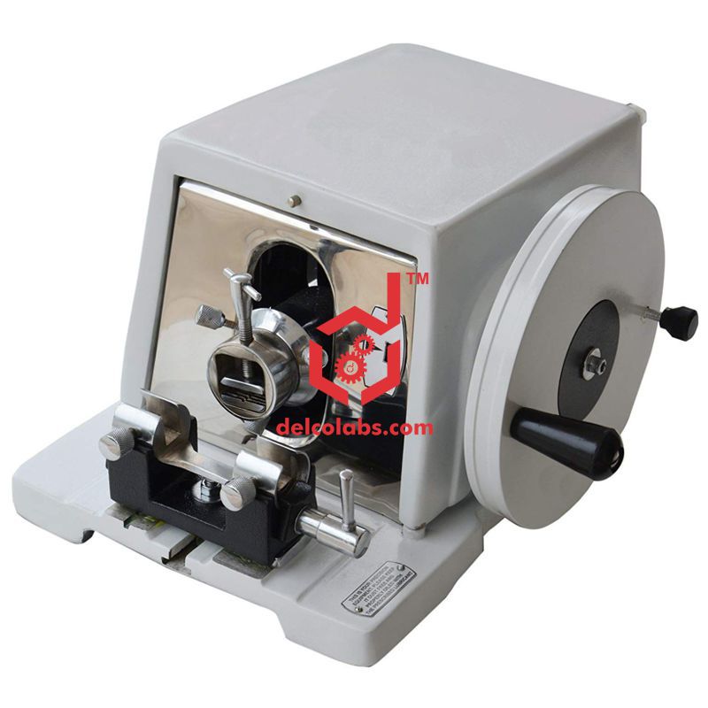 A heavy base with hinged cover for protecting the interior mechanism, and knife holder. With every complete revolution of the drive wheel, the feed panel engaged the teeth of ratchet wheel which advances the object holder through cone and inclined plane mechanism, tissue sections can be cut down to even 1μ. A safety device automatically disengages the feed mechanism. Feed indicator is in front and feed setting is at back of Microtome which sets 1μ to 50μ. A razor 120mm made from heat treated steel and tested for micro structure is supplied with instrument. It also has a tilting razor angle system adjustable up to 30° on a reference scale.